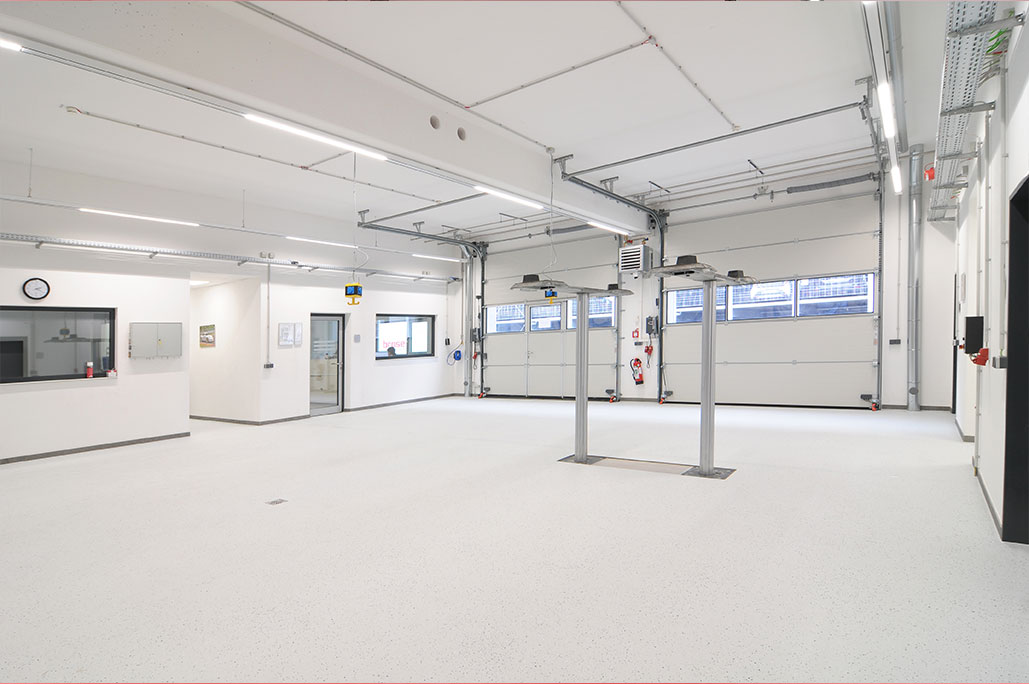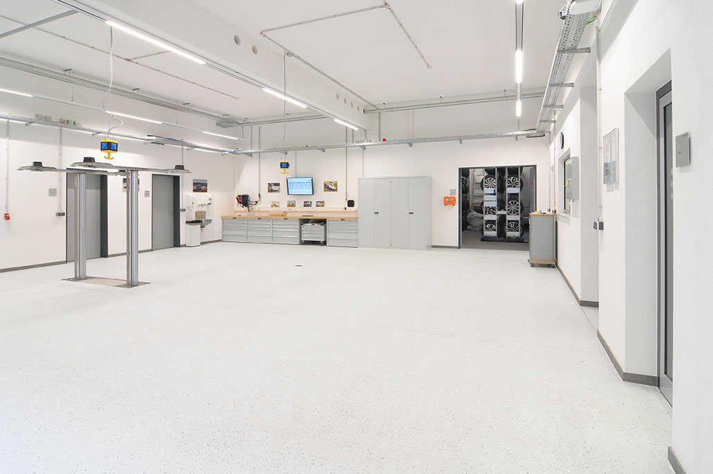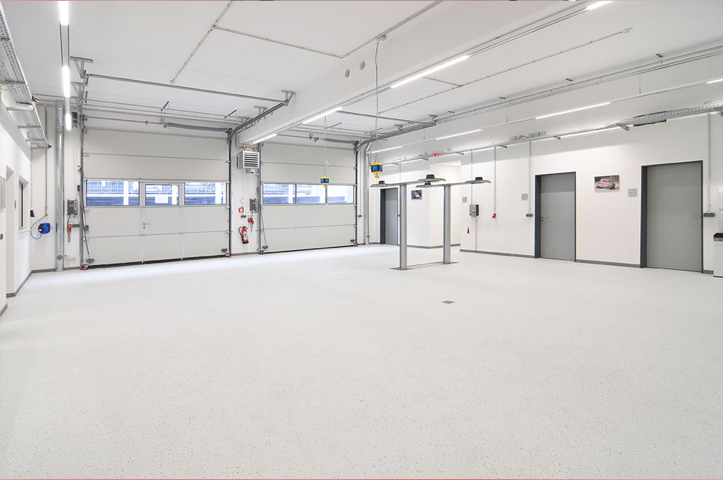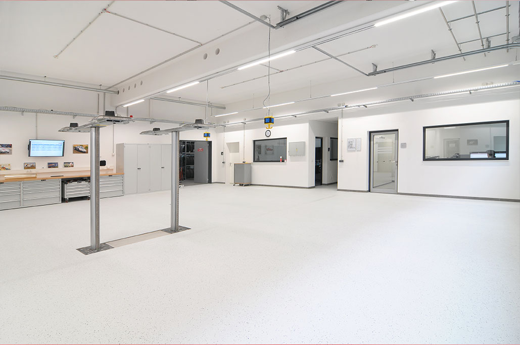 Danach wurde das Bodenbeschichtungssystem bestehend aus Grundierung, Reprofilierungsspachtelung und Verlaufsbeschichtung auf Basis eines elastifizierten Epoxidharzes mit einer Chipeinstreuung eingebaut. Als Finish wurde eine lösemittelhaltige Mattversiegelung für Industriebeläge mit erhöhter Beanspruchung appliziert. Die Mattversiegelung ist feinstrukturiert, hat hohe Chemikalienbeständigkeit, eine geringe Fleckanfälligkeit und erfüllt Rutschhemmstufe R10.