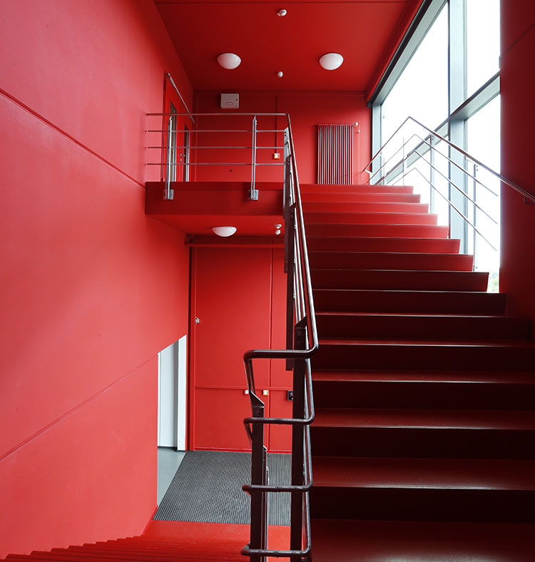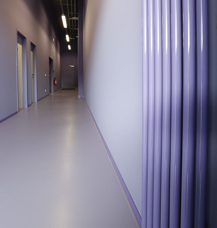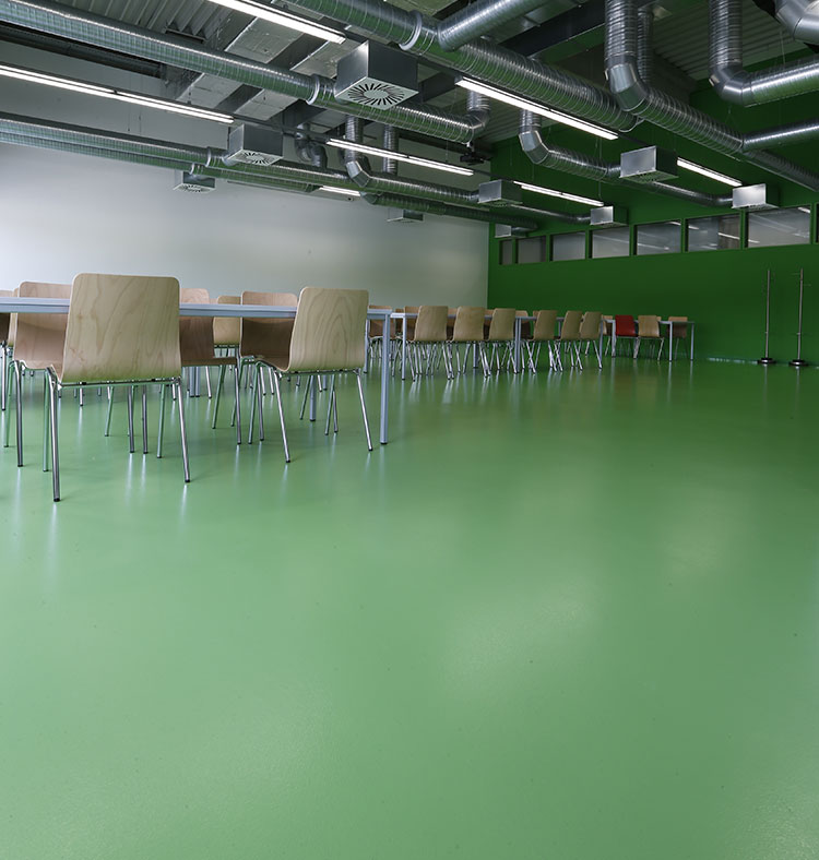 Knöller hat auf 1.600 m² Zement-Verbundestriche als Basis für die Beschichtung bzw. sonstige Bodenbeläge eingebaut. Auf ca. 700 m² wurde eine diffusionsfähige Bodenbeschichtung verlegt. Die Herausforderung bestand in der Umsetzung des Farbkonzeptes Boden/ Wand mit NCS-Farben, d.h. die Bodenbeschichtung musste exakt den Farbton der Wandfarbe entsprechen.