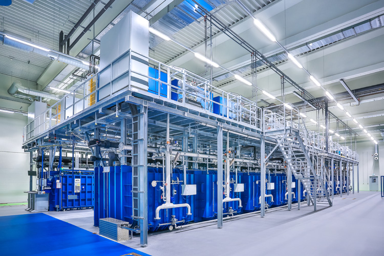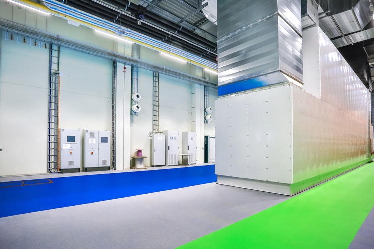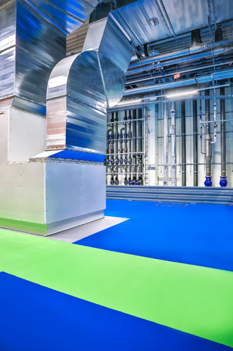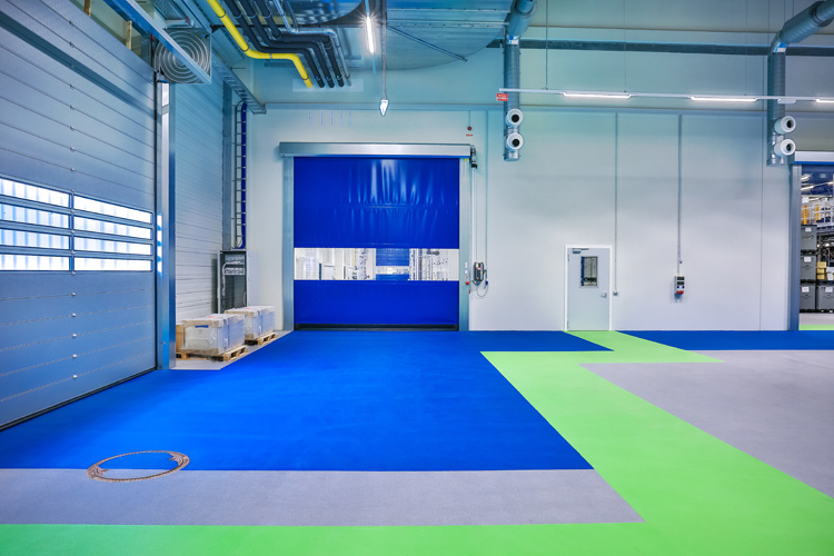 In der Produktionshalle wurde eine dreifarbige Acryl-Kunstharzbeschichtung bestehend aus Grundierung, Einstreubasisschicht und Versiegelung mit Rutschhemmklassen R11/R12 installiert. Die Transport- und Laufwege wurden jeweils farblich abgesetzt. Nach Fertigstellung der Teilflächen konnten nach 10 Stunden die Flächen sofort für den Maschineneinbau genutzt werden.