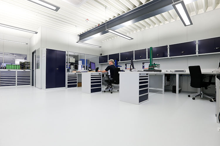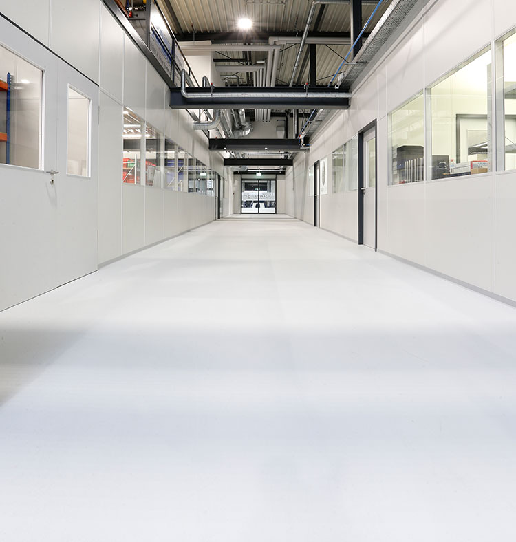 Für den Neubau „Produktionsbereiche“ wurde eine diffusionsoffene Bodenbeschichtung im Farbton Lichtgrau verwendet. Da die Halle komplett mit Fußbodenheizung ausgestattet ist, wurde ein diffusionsoffenes Bodenbeschichtungssystem eingesetzt. In den Büro- und Sozialbereichen wurde eine 6mm starke emissionsarme, elastische Polyurethan-Beschichtung eingebaut. Diese hochwertige Beschichtung hat einen hohen Gehkomfort und eine gute Trittschalverbesserung. Der Beschichtung weist hohe Verformbarkeit, Elastizität und gutes Rückstellvermögen auf.