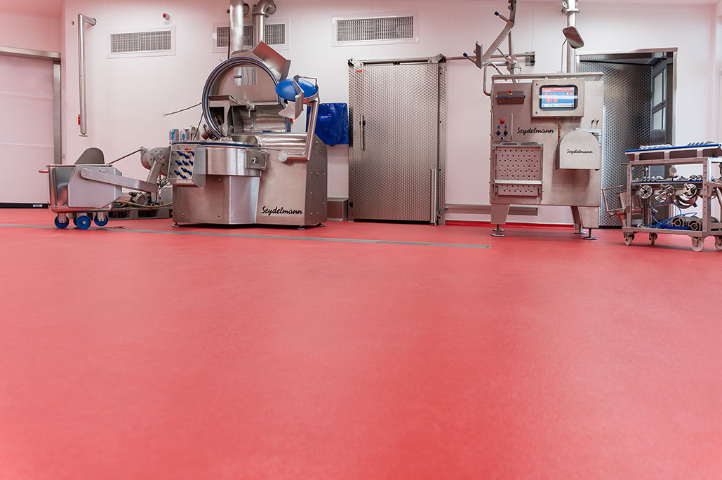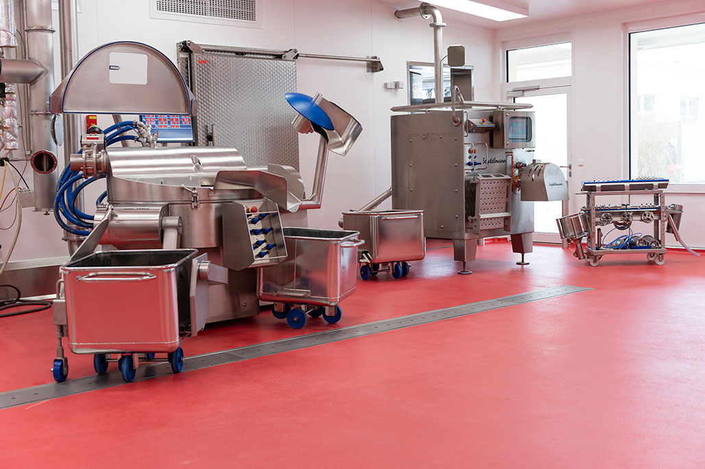 Entsprechend den Anforderungen der Lebensmittelindustrie wurde ein PU-Beton-Belag mit einer höchst-chemikalienbeständigen und resistenten Versiegelung eingebaut. Dieses Bodensystem ist für heißwasser- und chemikalienbelastete Nassbereiche mit hoher mechanischer Belastung ausgelegt. Es wurde im Vorfeld die Entwässerungstechnik bestehend aus 30 lfm. Edelstahl-Rinnen inkl. Bodeneinläufe gesetzt, fixiert und montiert.