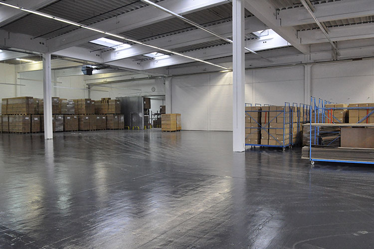 In den sieben Hallenteilen wurde der Magnesiaboden kugelgestrahlt, Fehlstellen und Fugen herausgenommen und vermörtelt. Anschließend wurde eine Bodenbeschichtung bestehend aus Grundierung, Deckschicht und Versiegelung in anthrazitgrau, Oberfläche glänzend aufgebracht. Die Arbeiten wurden in einem Zeitfenster von knapp 4 Wochen in Abstimmung mit den Gewerken Wand und Decke durchgeführt, damit der zukünftige Mieter das Weihnachtsgeschäft bereits in den Räumen durchführen konnte.
